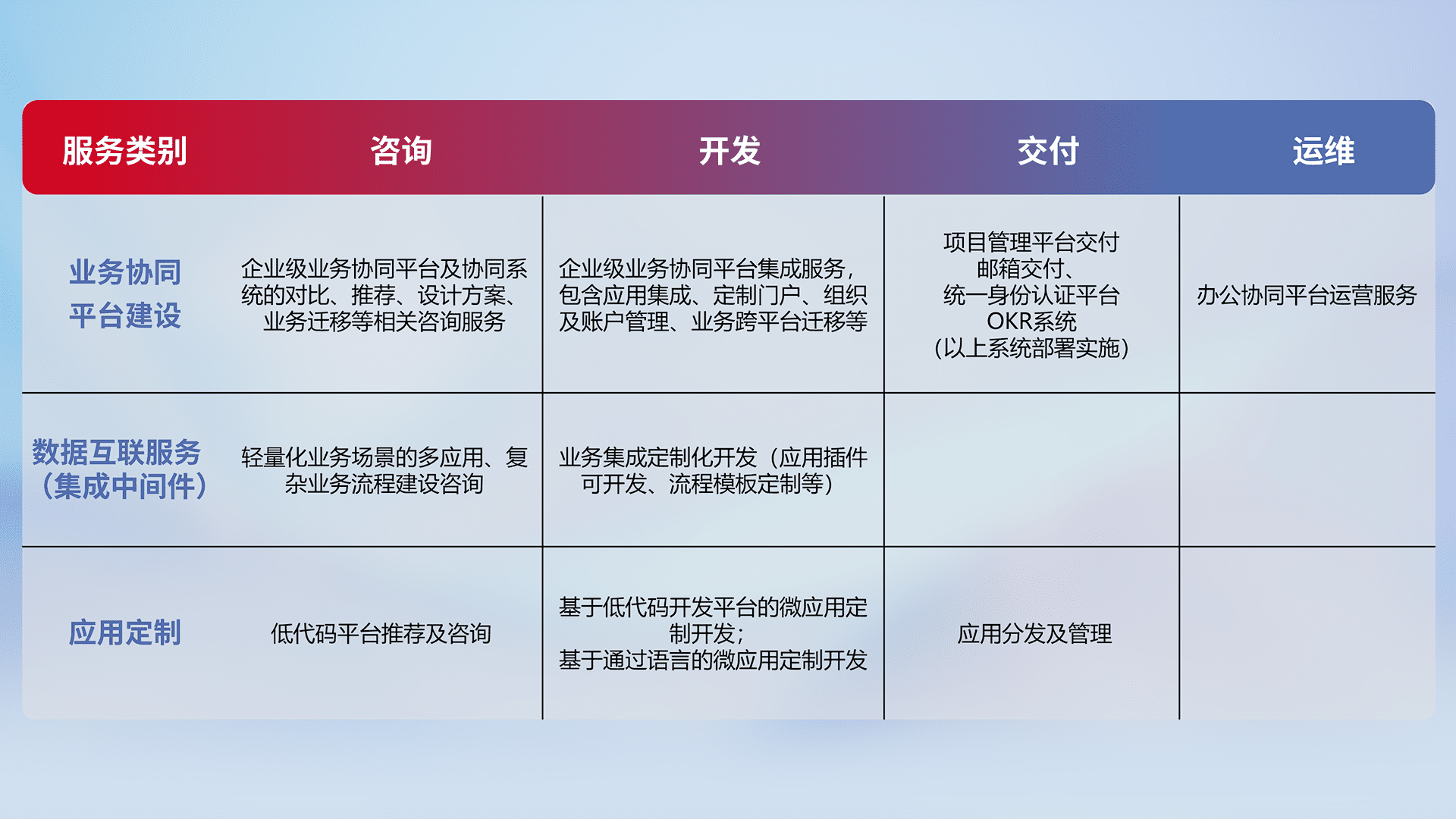 针对钉钉、、、、企微、、、IDaas等平台级产品提供产品的规划、、、、方案、、、、交付、、、、定制化开发等服务,,实现如统一协同办公、、智能客户服务、、、、混合会议管理、、、、智能数据查询、、、等业务场景,,实现数字化转型。。